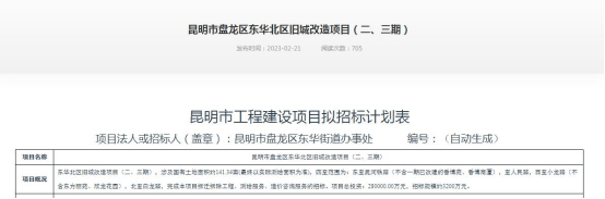 2月21日,云南省公共资源交易信息网发布昆明市盘龙区东华北区旧城改造项目(二、三期)招标计划,涉及国有土地面积94226平方米,约141.34亩。
