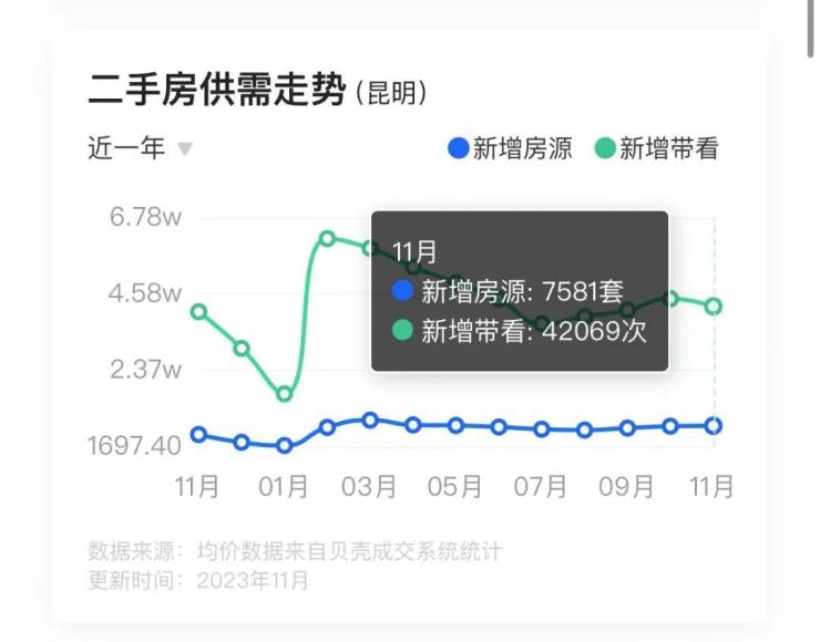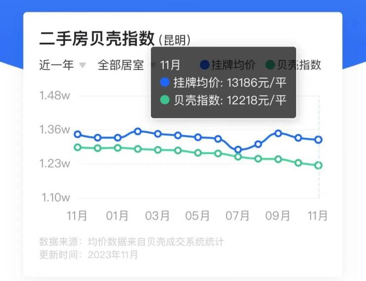 根据贝壳二手房数据,昆明10月份挂牌均价约13256元/平方米,11月份挂牌均价约13186元/平方米。