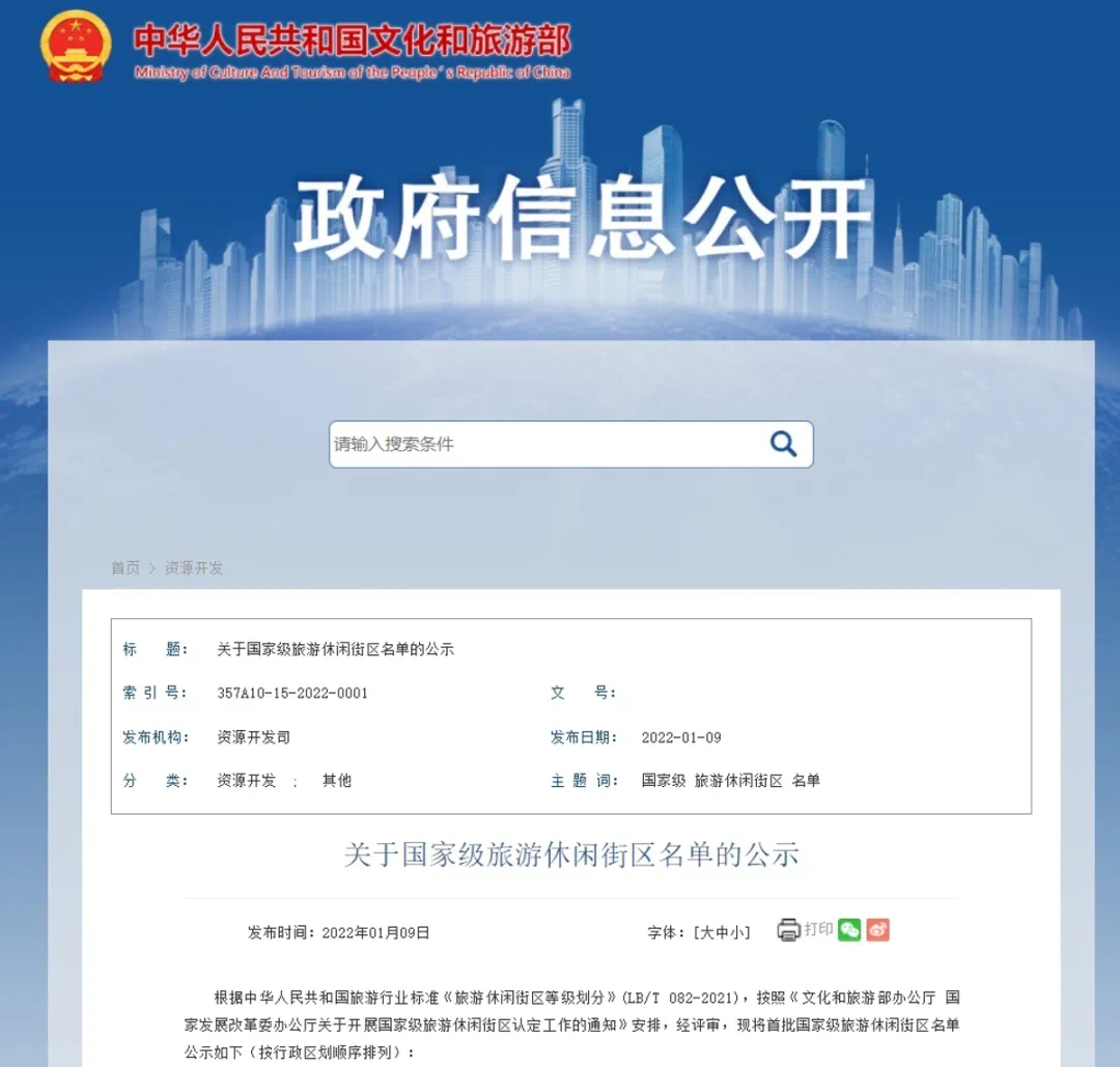 根据中华人民共和国旅游行业标准《旅游休闲街区等级划分》(LB/T 082-2021),按照《文化和旅游部办公厅 国家发展改革委办公厅关于开展高级旅游休闲街区认定工作的通知》安排,经评审,现将首批高级旅游休闲街区名单公示如下(按行政区划顺序排列):
