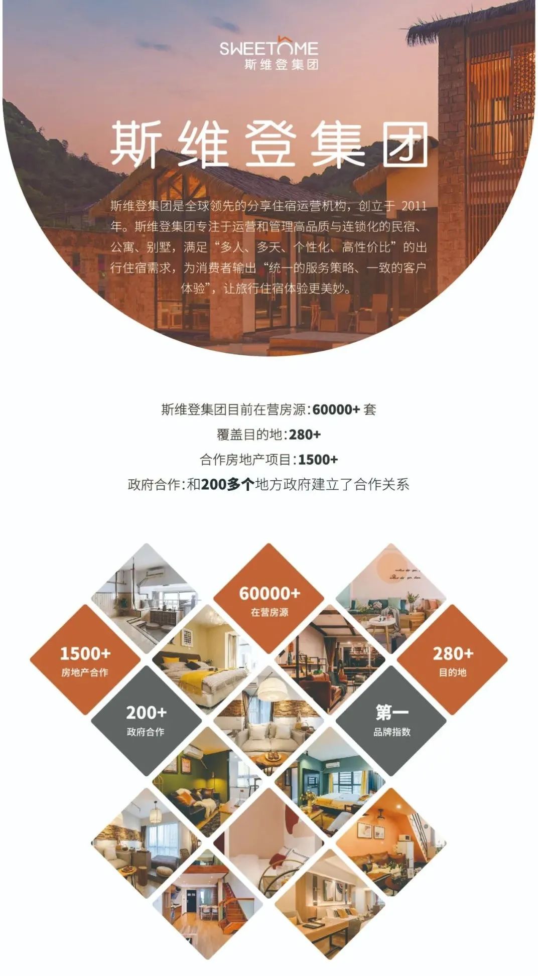 斯维登是亚洲地区专注于异地不动产管理的头部企业,是全球先进的分享住宿运营机构,专注营运和管理高品质与连锁化的民宿、公寓、别墅。目前,斯维登集团在全球共280多个目的地营运,超过80000+套房源,旗下拥有斯维登公寓、家蜓、途远、途礼、途窝、欢墅别墅、特色民宿等诸多产品品牌。同时也是携程网、Airbnb、58同城等国内著名酒店、民宿、旅游平台的房源头部供应商。