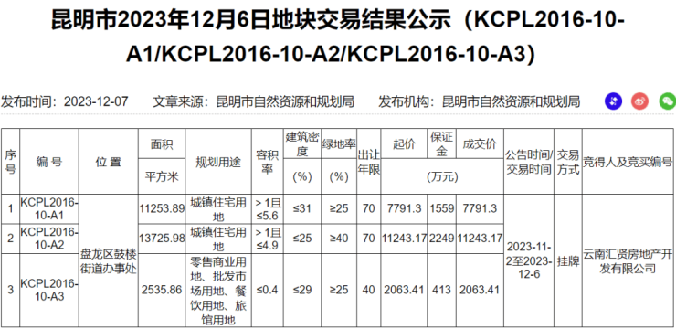 2023年12月,该批土地重新挂牌后被云南汇贤房地产开发有限公司以2.1亿元竞得,按照约2.1亿元的成交价计算,初始楼面价约1236-20342元/㎡。