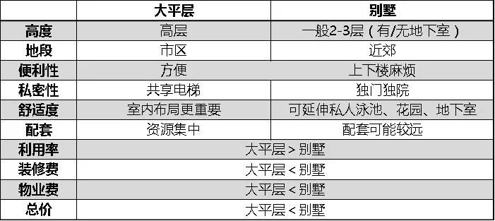 那么大平层和别墅各自具有哪些特性,从下表中能大概了解一下(内容以市场上楼盘的一般情况为例)。