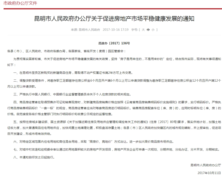 第一份文件为2017年10月11日印发的《昆明市人民政府办公厅关于促进房地产市场平稳健康发展的通知》(昆政办〔2017〕136号)。