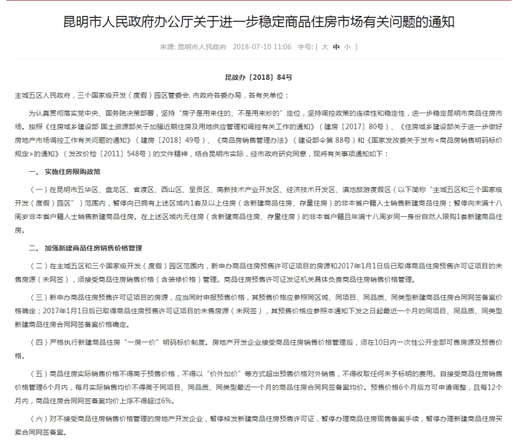 第三份文件为2018年7月1日印发的《昆明市人民政府办公厅关于进一步稳定商品住房市场有关问题的通知》(昆政办〔2018〕84号)。
