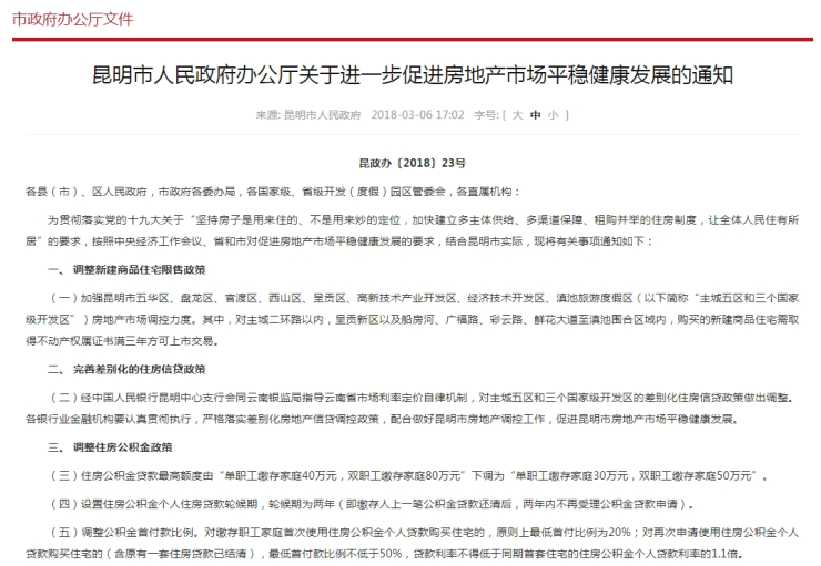 相较于呈贡新区的限售,这份文件的影响力算是很大了,昆明主城二环以内区域以及南市区实施3年限售政策,公积金额度调整,差别化信贷政策、预售环节土地抵押管理、限价商品房、培育租赁市场等内容,着实给当年的昆明楼市带来了很大的冲击力。
