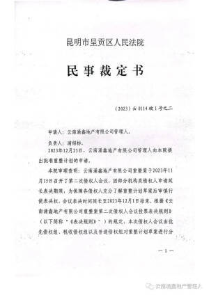 发布的消息内容显示,呈贡区人民法院核查后,于2023年12月26日作出(2023)云0114破1号之二号民事裁定书,裁定批准云南涌鑫地产有限公司重整计划,终止云南涌鑫地产有限公司重整程序。此次暂未公开披露重整计划的具体内容,暂无从得知重整投资人身份和具体投资方式。