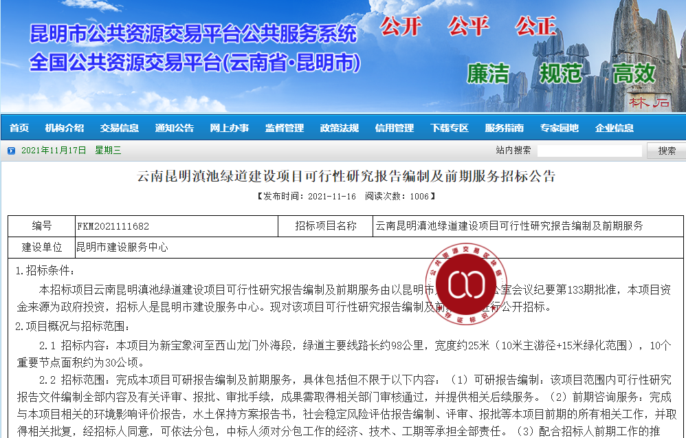 11月16日,昆明市公共资源交易平台发布《云南昆明滇池绿道建设项目可行性研究报告编制及前期服务招标公告》。