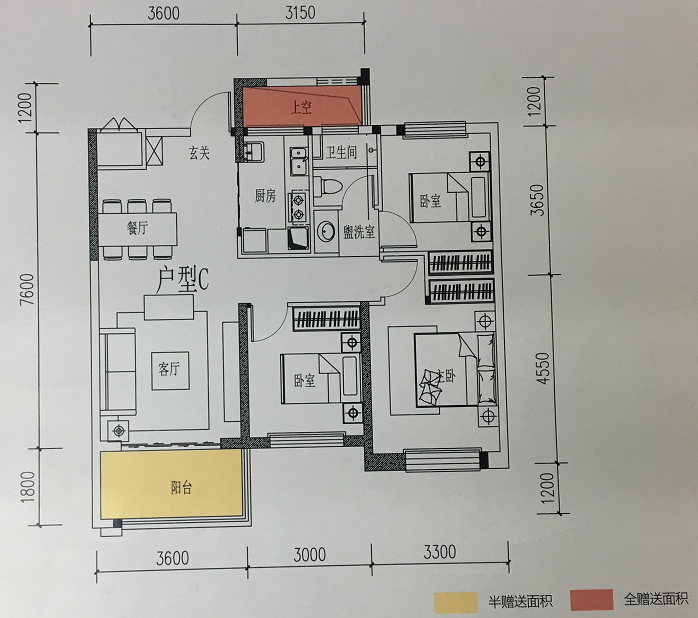 97㎡C户型,温馨三房设计,户型方正,全明采光,超大景观阳台,餐客一体,有效利用空间。