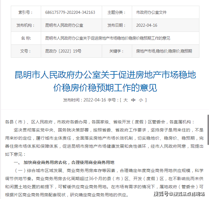 《昆明市人民政府办公室关于促进房地产市场稳地价稳房价稳预期工作的意见》:
