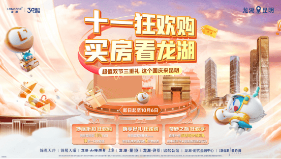 十一狂欢购,置业看龙湖,龙湖在昆明超值双节三重礼,好房限量入席,钜惠限时抢定,错过再无的折扣,燃动黄金周。