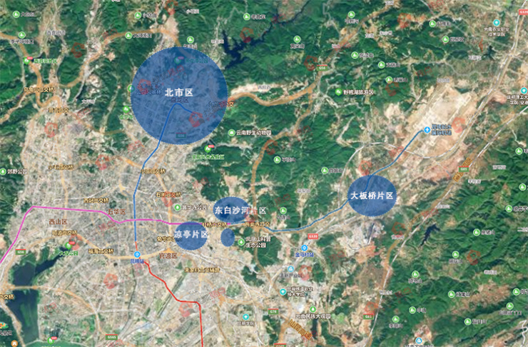 东片区主要是指凉亭片区-东白沙河-方旺片区-大板桥片区几个版块串联的区域。几个版块共同发力,促进了整个东片区的发展。主要以东白沙河片区和大板桥版块为主,其余两个版块为辅。