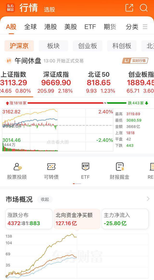 4月29日周一,A股震荡走强,创业板指拉升涨逾3%,深成指涨2.81%;沪指涨0.8%,时隔6个交易日(4月18日盘中最高价3102.55点)重回3100点站上年线。券商、房地产等方向涨幅居前,沪深京三市上涨个股4300多只。