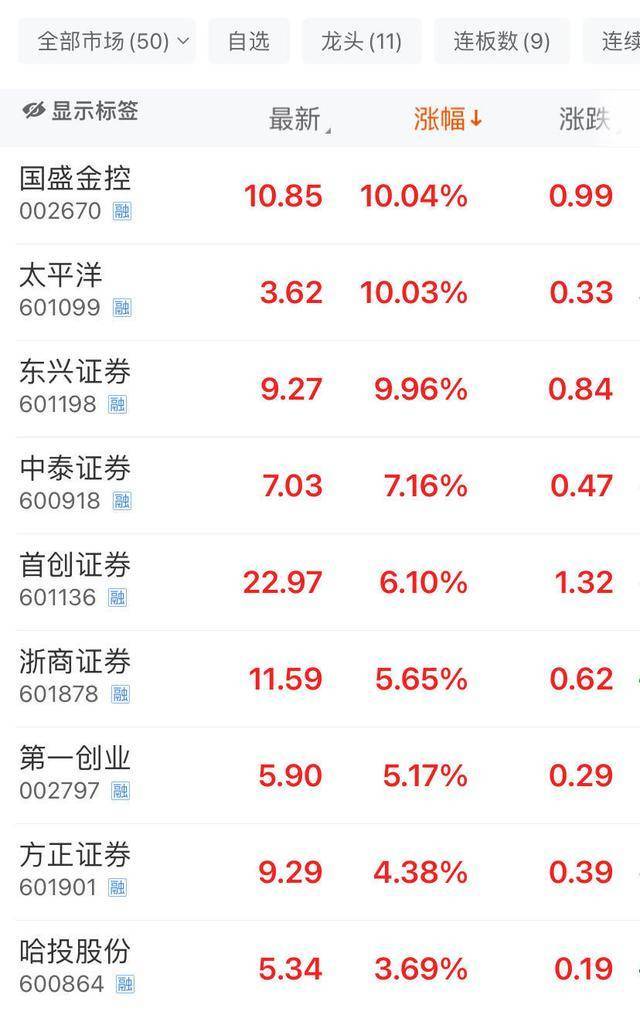 A股证券板块早盘震荡拉升,太平洋、东兴证券、国盛金控涨停,首创证券、中泰证券、浙商证券等涨超6%。