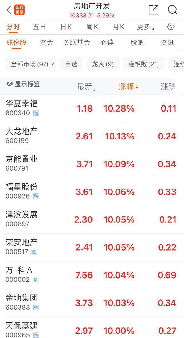今天上午,房地产板块的表现,可以说是A股的一个重要支撑。盘面上,房地产板块集体大涨,万科A、金地集团、大龙地产、荣盛发展等20余股涨停。