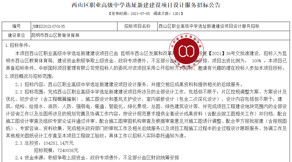7月5日,昆明市公共资源交易中心发布了“西山区职业高级中学选址新建建设项目设计服务招标公告”。
