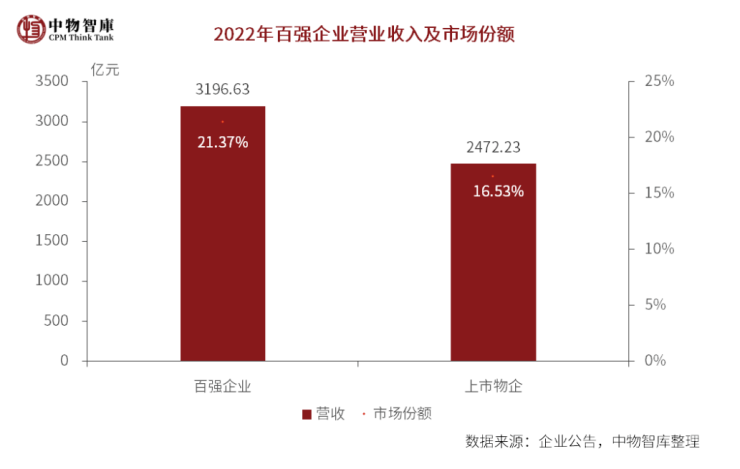 百强物企在营业收入方面达到3196.63亿元,市场份额为21.37%。同期,样本上市物企营业收入2472.23亿元,增速由上年的44.38%放缓至19.38%,市场占有率较上年增加0.93个百分点至16.53%。