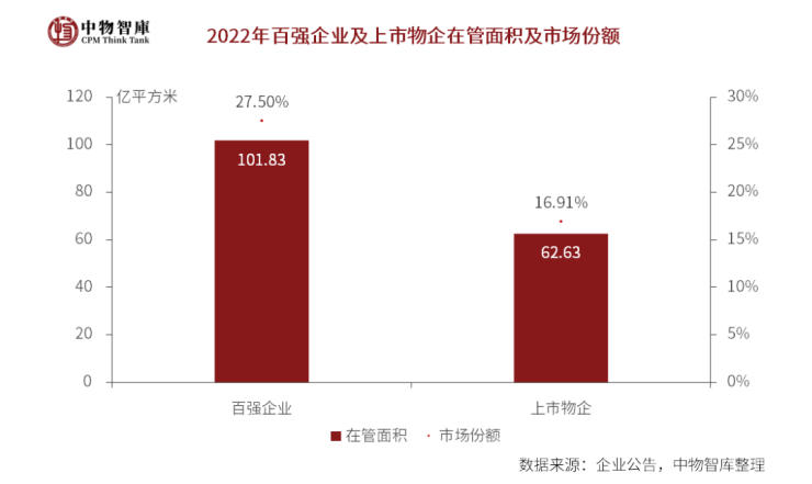 《报告》显示,2022年,百强物企在管面积达101.83亿平方米,所占市场份额达27.50%。虽然高速增长的时代结束,物业行业的发展格局分散,但尚未形成寡头垄断局面,未来的市场竞争仍将更加激烈。百强企业在资源禀赋、自身拓展能力和服务实力、品牌势能上都具有更强的市场竞争力,市场份额和提升空间有望得到进一步提升。