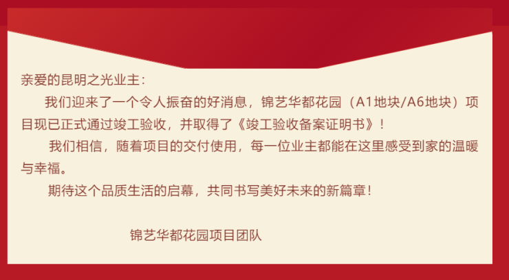 2月1日,锦艺昆明之光发布锦艺华都花园(A1、A6地块)项目取得竣工验收备案证明书,紧接着,2月4日,锦艺·昆明之光迎来交付。