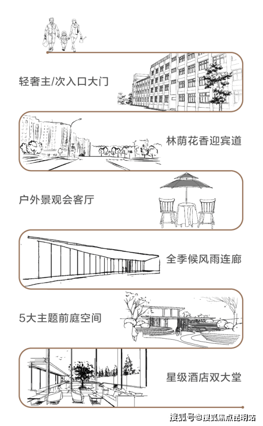 营造“轻奢主/次入口大门 、林荫花香迎宾道、户外景观会客厅、全季候风雨连廊、5大主题前庭空间、酒店级双⼤堂”6大尊崇归家礼序,匹配业主的上乘生活;前庭融合“听溪涧/闻青林/觅花径/忆农场/引蜂谷”五大花园景观,让业主,在自然之中,寻回内心的美景。