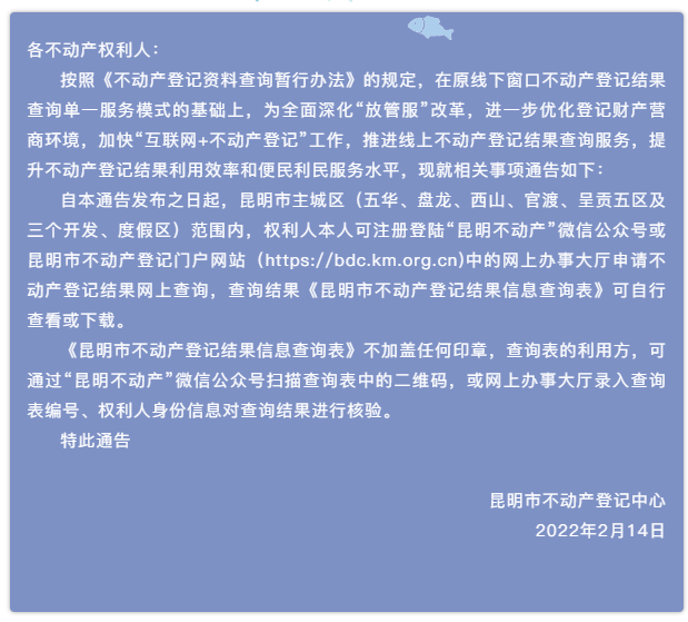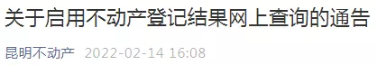 2月14日,昆明市不动产登记中心发布了“关于启用不动产登记结果网上查询的通告”。全文如下↓