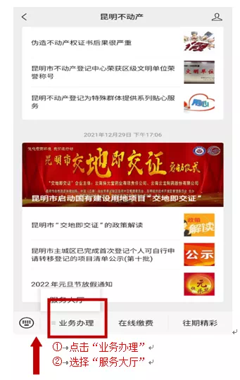 排名前列步:访问“昆明不动产”微信公众号并完成实名注册,点击下方的“业务办理”,选择“服务大厅”。