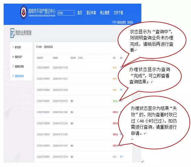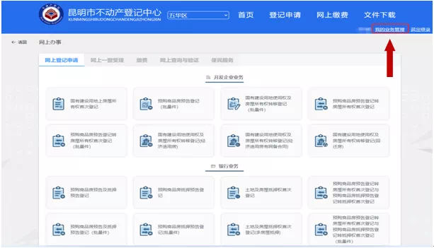 一是查询申请提交完成1小时后,登陆昆明市不动产登记中心门户网站,进入“网上办事大厅”点击右上角“我的业务管理”。