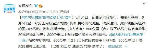 此次涨价,是自2022年2月5日恢复征收国内航线燃油附加费以来,第四次上调燃油附加费: