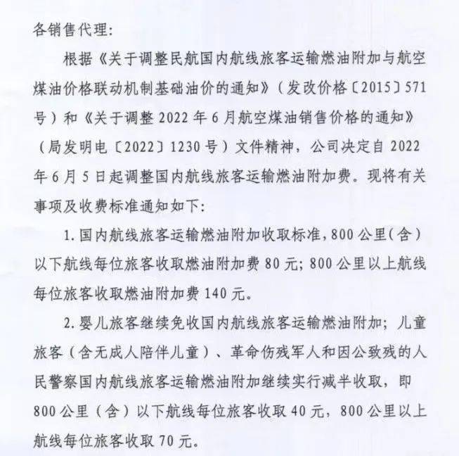 3月5日开始调整征收标准,800公里(含)以下航线每位旅客收取20元燃油附加费,800公里以上航线每位旅客收取40元燃油附加费。
