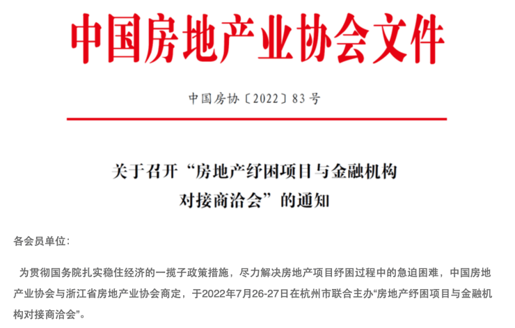 6月22日,记者了解到,中国房地产业协会与浙江省房地产业协会商定,将于7月26-27日在杭州联合主办“房地产纾困项目与金融机构对接商洽会”。
