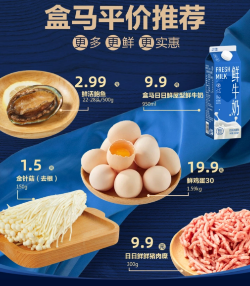 品类没有其他城市多,但可以明确感受一贯走高端路线的盒马也开始深入低价市场,19.9元30枚鸡蛋,9.9元950ml的当日鲜牛奶,2.99元的活鲍鱼,超低价的商品成功占领了一大波客群,甚至价格已经打破传统菜市。