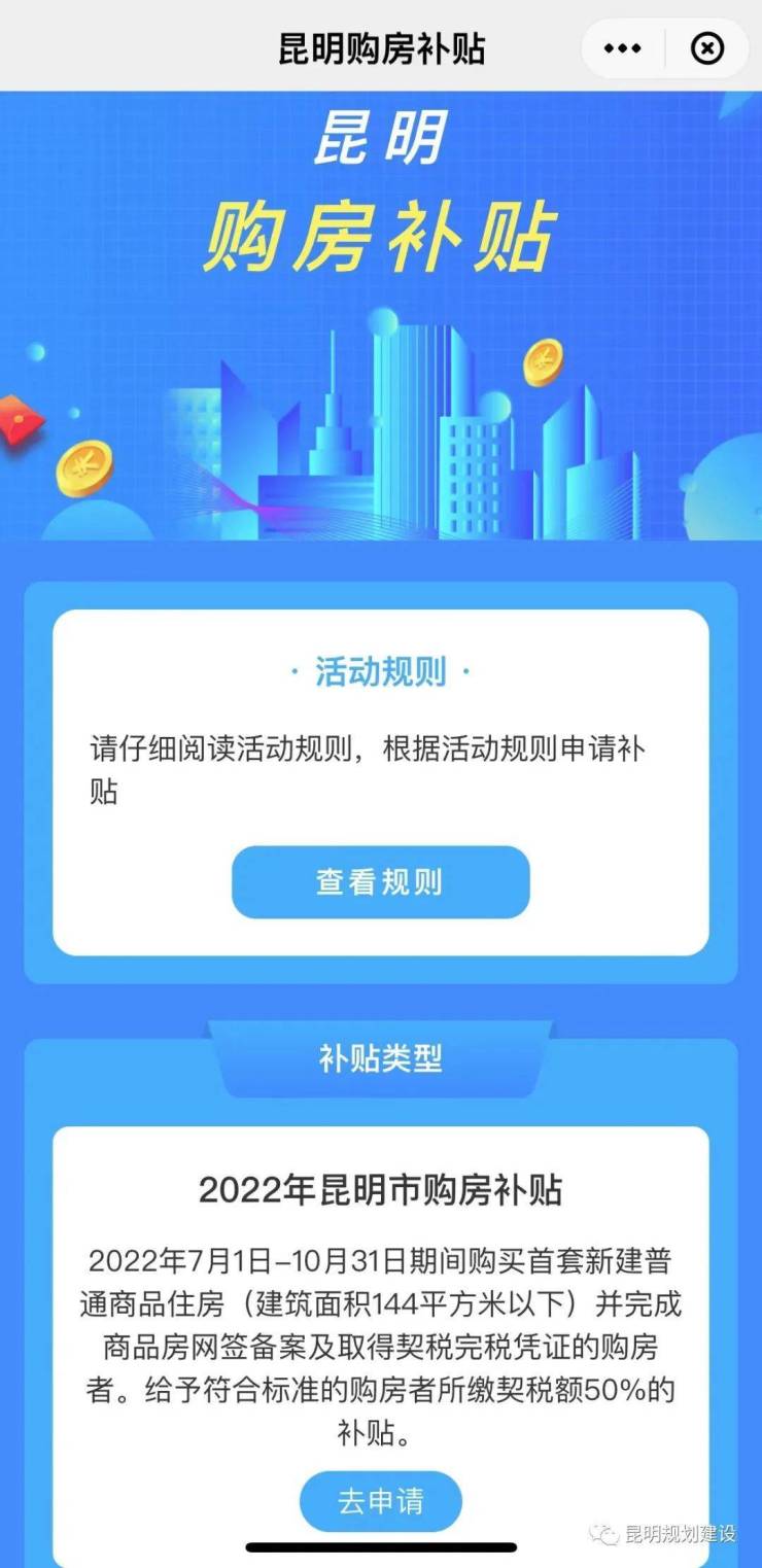 8月29日,昆明市住房和城乡建设局下发《2022年昆明购房补贴发放实施细则》,即日起对2022年7月1日至10月31日期间购买首套新建普通商品住房(建筑面积144平方米以下)并完成商品房网签备案及取得契税完税凭证的购房者予以补贴。