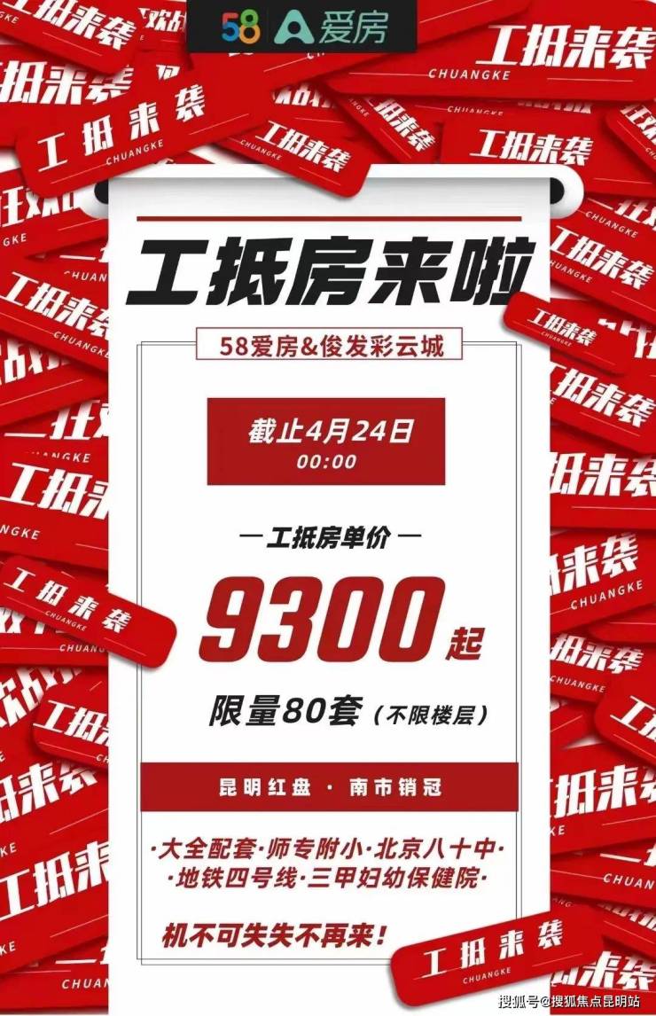 俊发彩云城推出80套工抵房,单价9300元/平方米起,在售面积段约86-115平方米。