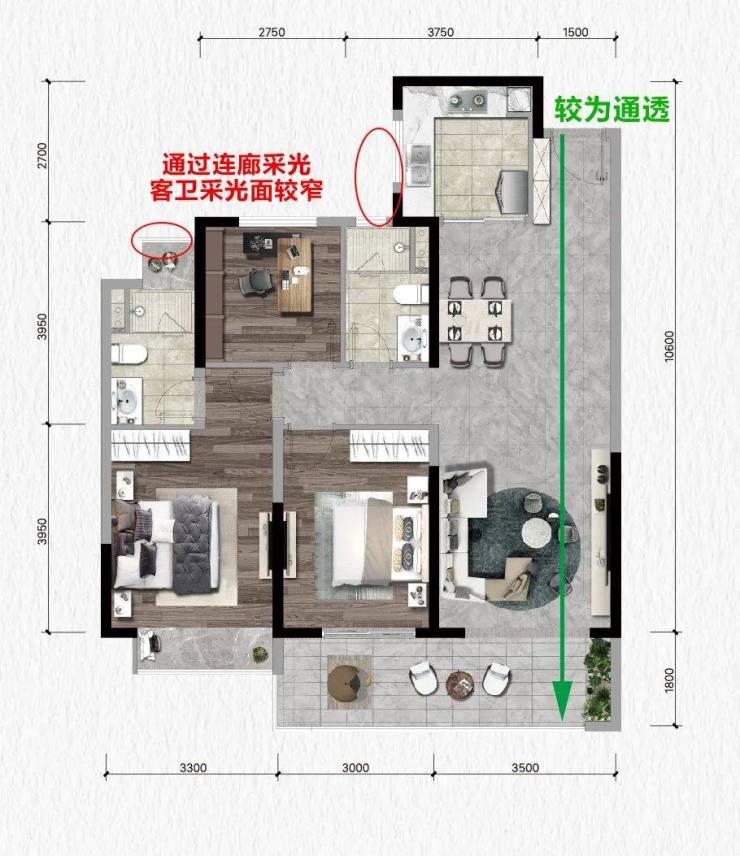 该户型虽然是中户,但是所有房间都是全明采光,又有6.5米面宽的南向通体大阳台加持,整体通透性还可以,只是北向次卧和卫生间面对连廊,隐私采光会受到一定影响,客卫采光面也比较窄,主卫有飘窗会稍好些。