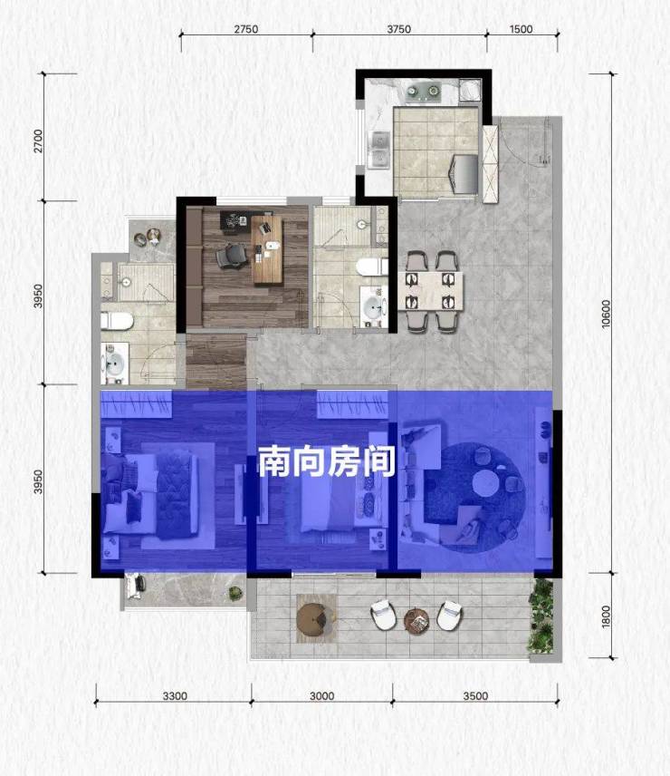 从该户型来看,整体朝向是南向(5栋是南偏西,6栋是南偏东),客厅、主卧、次卧三开间朝南,并且还有南向6.5米大阳台,只有一个北向次卧,其余都是厨房、卫生间等区域,照顾到了大部分房间的采光采阳,就看个人是喜欢偏东还是偏西。