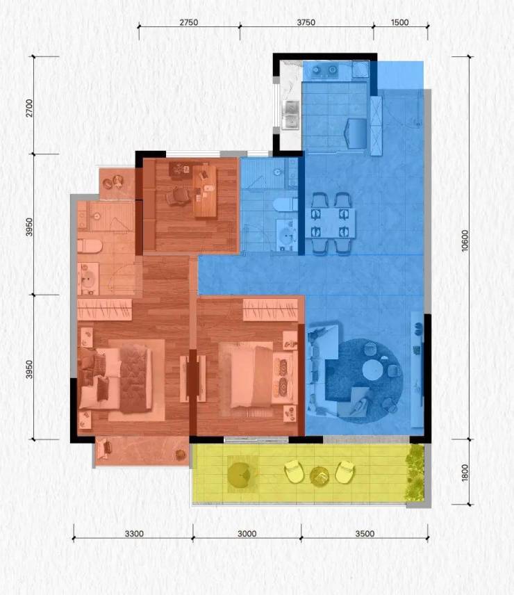 这里有两项指标:①动静分离:频繁活动区(客厅、餐厅、厨房等)与休息区(卧室,书房,衣帽间等)分开;②干湿分离:卫生间的淋浴区和面盆区分隔。