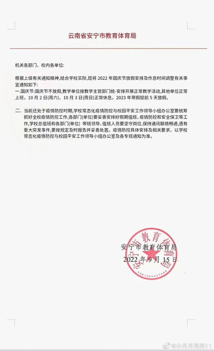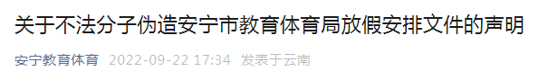 安宁市教育体育局9月22日发布《关于不法分子伪造安宁市教育体育局放假安排文件的声明》。