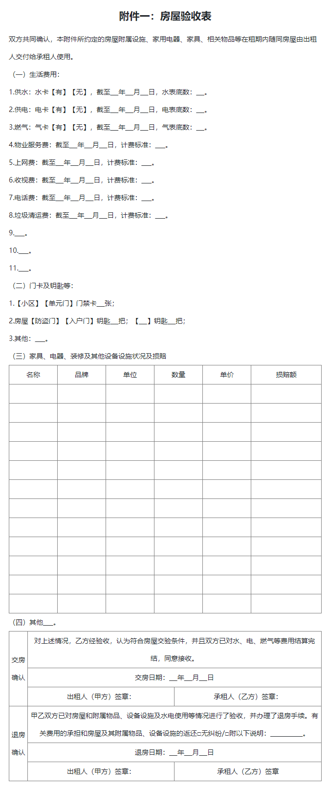 目前云南省的租赁合同范本,附有《房屋验收表》,该附件可以明确地约定房屋附属设施、家用电器、家具、相关物品等在入住前的状况及赔损额度。