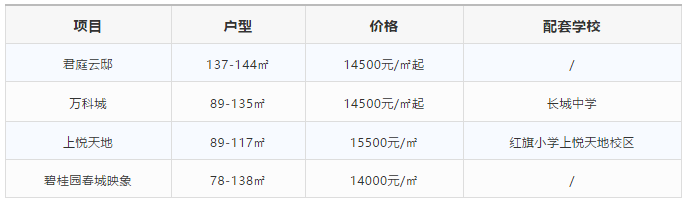 目前,随着新希望白麓城、和悦铭著、融创春风十里等项目的相继售罄,目前区域内有住宅在售的项目并不算多,仅有万科城、上悦天地、君庭云邸以及碧桂园春城映象。