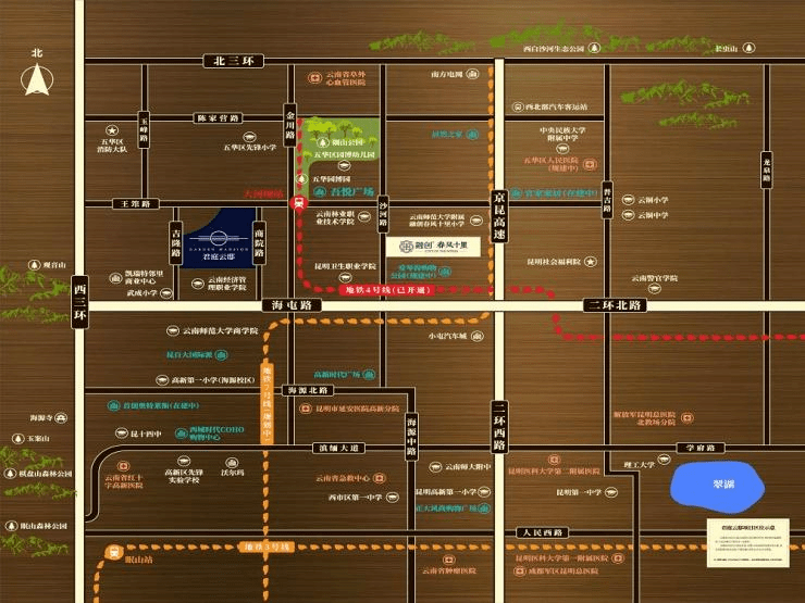 君庭云邸项目位于西北新城海屯路和金川路交汇处,周边有王筇路、陈家营路、昆武高速、普吉路以及西三环等交通路网环绕。项目总占地面积约129.8亩,2021年6月交付。
