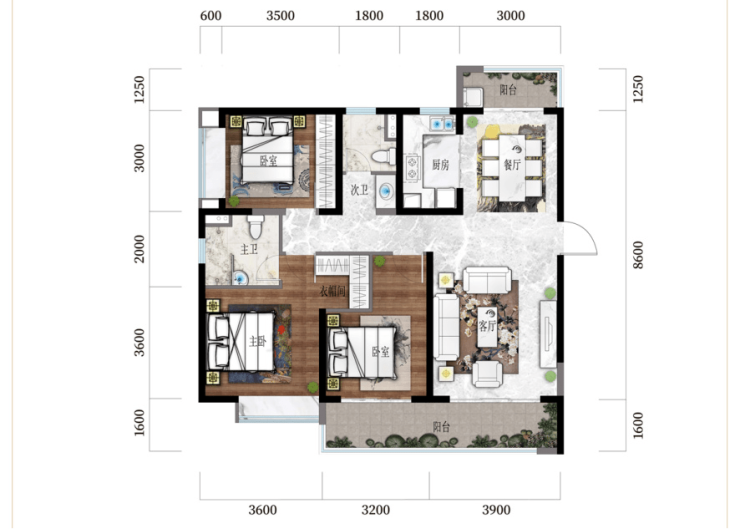 建面约127㎡的户型三室两厅两卫双阳台,户型算是目前市面上比较主流的设计。