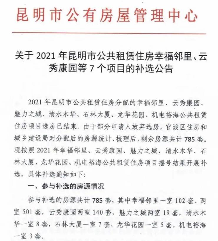 6月17日,昆明市公有房屋管理中心发布公告,2021年昆明市公共租赁住房分配选房已结束,由于部分申请人放弃选房,因此出现剩余房源,西山区人和新居两室剩余房源18套,官渡区幸福邻里、云秀康园、魅力之城、清水木华、石林大厦、龙华花园、机电裕海剩余房源共计785套。