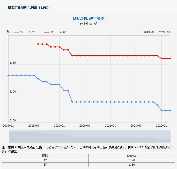 中国人民银行授权全国银行间同业拆借中心公布,2022年3月21日贷款市场报价利率(LPR)为:1年期LPR为3.7%,5年期以上LPR为4.6%。以上LPR在下一次发布LPR之前有效。
