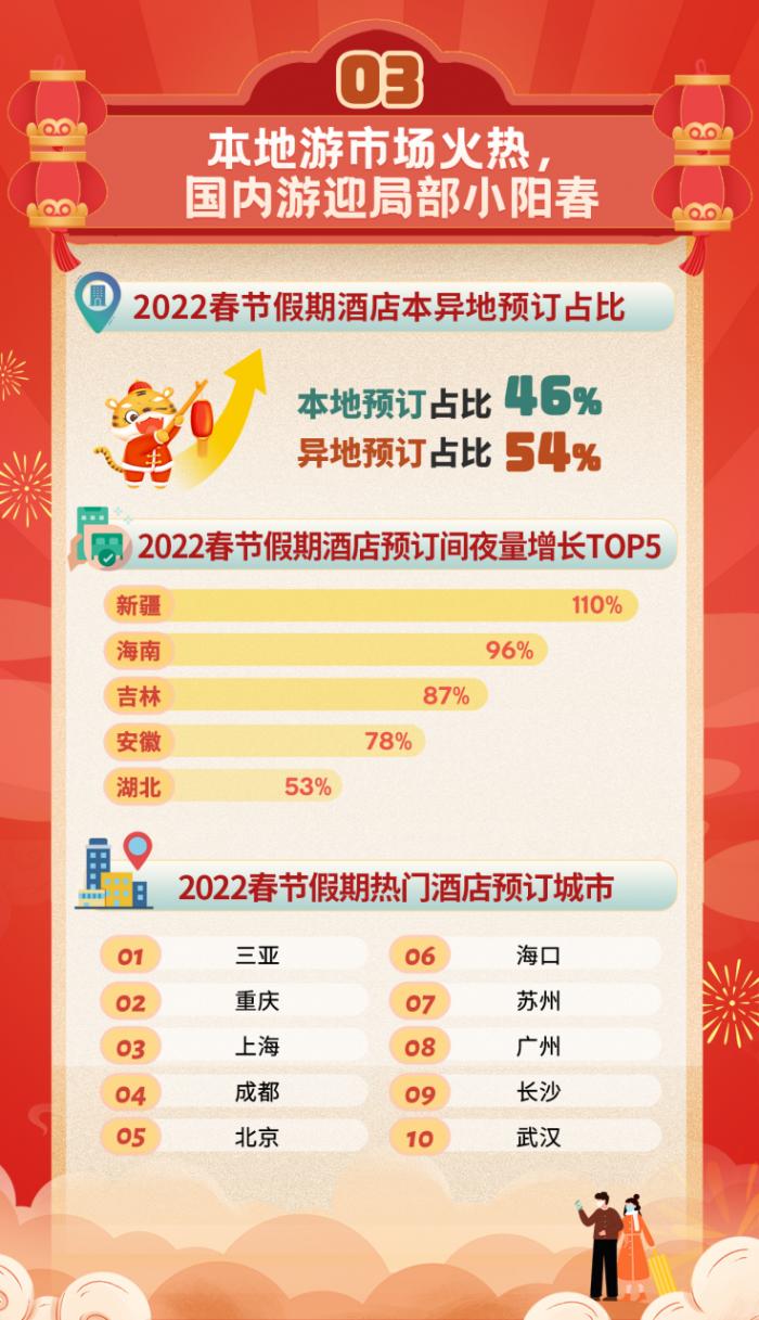 国内疫情防控成果显著的背景下,部分目的地的国内游市场也迎来小阳春,同程旅行数据显示,今年春节假期期间,新疆酒店预订间夜量较去年春节同期增长110%,海南酒店预订间夜量增长96%,吉林、安徽、湖北等省份酒店预订也出现大幅增长。