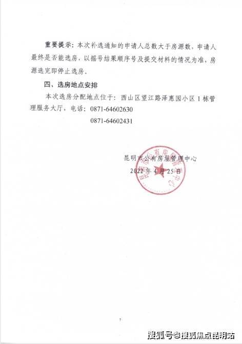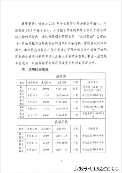 参与2021年公共租赁住房分配的申请人,请仔细查看2021年摇号公示,如摇号结果的顺序号在提交材料安排的号段内,请按照昆明安居网首页“在线帮助”公布的《申请公共租赁住房提交材料清单》准备材料,并在规定时限内提交。本次补选可能存在部分申请人不符合选房条件或放弃选房,因此通知提交材料的申请人总数大于补选房源数,申请人最终是否能选房,以摇号结果的顺序号及提交材料的情况为准。