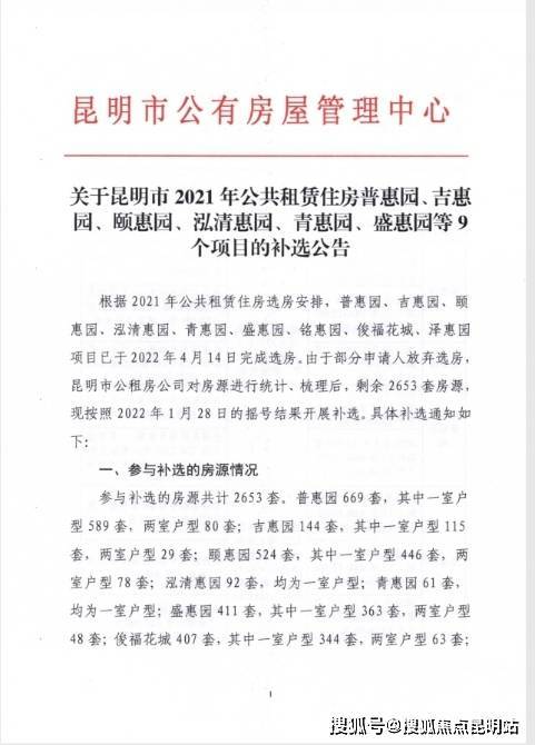 4月25日,昆明市公租房管理中心发布《关于昆明市2021年公共租赁住房普惠园、吉惠园、颐惠园、泓清惠园、青惠园、盛惠园等9个项目的补选公告》,2653套房源将进行补选。