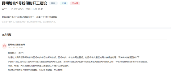 昆明市交通运输局回复:9号线一期工程拟纳入昆明市轨道交通建设第三期规划上报,昆明市交通运输局正积极推进第三期建设规划报批工作,待取得批复后按批准内容启动建设。