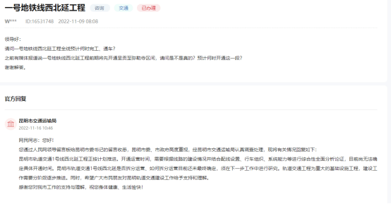 昆明市交通运输局回复:昆明市轨道交通1号线西北延工程正按计划推进。开通运营时间,需要根据线路的建设情况并结合配线设置、行车组织、系统能力等进行综合性全面分析论证,目前尚无法确定具体开通时间。