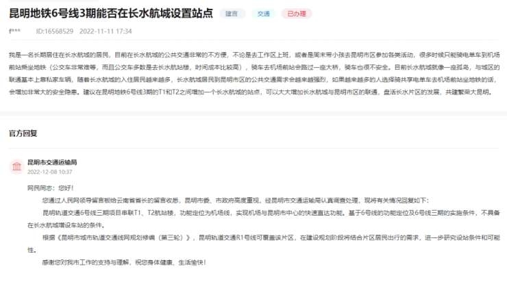 昆明市交通运输局回复:昆明轨道交通6号线三期项目串联T1、T2航站楼,功能定位为机场线,实现机场与昆明市中心的快速直达功能。基于6号线的功能定位及6号线三期的实施条件,不具备在长水航城增设车站的条件。