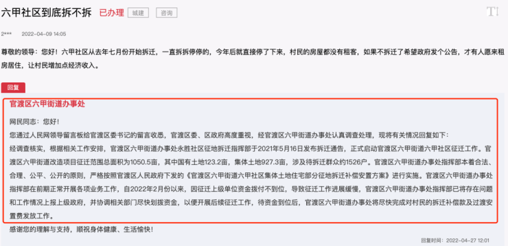 这些城改项目一直备受市民关注。4月初就有网友在人民网地方领导留言板询问:“六甲社区到底拆不拆”。