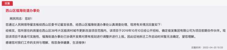直到今年4月20日,西山区福海街道办事处在回复网友提问时提及:“船房村城市更新改造项目于2019年10月10日经公开招标,确定俊发集团有限公司为项目前期合作伙伴。现因该项目不具备可实施性,福海街道办事处已协调开发商对原有规划进行调整并进行上报。因此征地拆迁工作启动时间暂无法确定。”